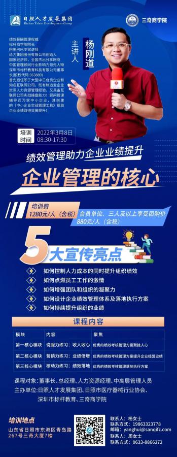 日照人才發(fā)展集團有限公司與日照市醫(yī)療器械行業(yè)協(xié)會、深圳市標(biāo)桿教育、三奇商學(xué)院將于2022年3月8日共同組織舉辦《企業(yè)管理的核心》績效管理專題培訓(xùn)。現(xiàn)已開班報名中,期待您的參與!