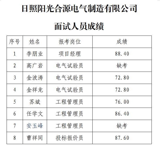 日照陽光合源電氣制造有限公司公開招聘勞務(wù)派人員面試成績公示