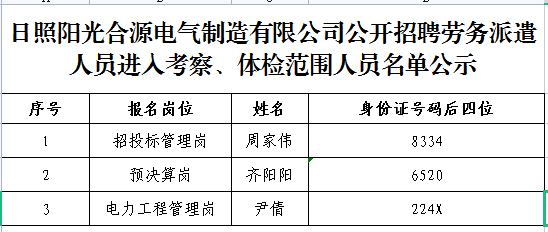 日照陽光合源電氣制造有限公司公開招聘勞務(wù)派遣人員進(jìn)入考察、體檢范圍人員名單公示