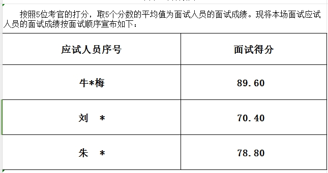 受日照城投物業(yè)管理有限公司委托,日照人才發(fā)展集團(tuán)于2023年10月17日在日照人才發(fā)展集團(tuán)網(wǎng)站和日照人才集團(tuán)微信公眾平臺(tái)面向社會(huì)公開發(fā)布《日照惠佳餐飲管理有限公司公開選聘職業(yè)經(jīng)理人簡章》。根據(jù)簡章要求,報(bào)名時(shí)間從自2023年10月18日起至10月27日下午17:00截止。本次共有4人報(bào)名,經(jīng)過資格審查,最終3人符合報(bào)名條件,進(jìn)入面試環(huán)節(jié)。面試于2023年11月3日下午在日照人才發(fā)展集團(tuán)舉行。現(xiàn)將面試成績公示如下。公示時(shí)間:2023年11月3日至2023年11月9日,如有異議,請(qǐng)撥打電話:0633-8778515。