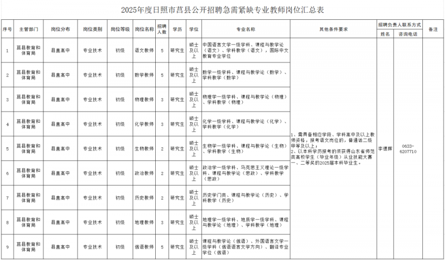 具體招聘崗位、招聘人數(shù)及專業(yè)要求詳見《2025年度日照市莒縣公開招聘急需緊缺專業(yè)教師崗位匯總表》(附件1)。